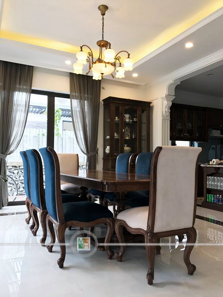 Thiết kế ghế sofa được gia chủ lựa chọn có tone màu xanh navi ấn tượng giúp mang lại sự cân bằng về màu sắc cho không gian. Các đường cong hay trạm khắc tinh xảo nơi ghế tựa, bàn nước, hay ghế dài, hay chất liệu nhung mềm mại là những yếu tố góp phần lớn định hình nét tân cổ điển cho thiết kế.