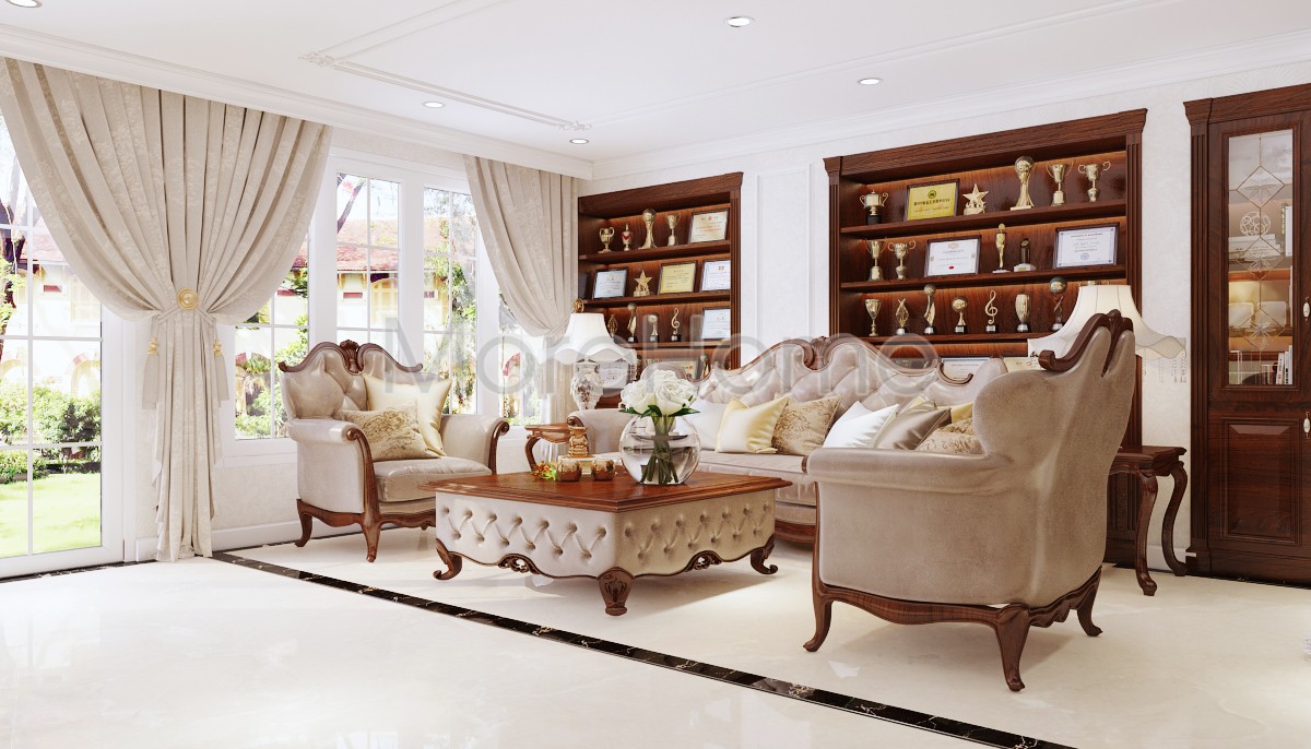 Phòng khách tân cổ điển này được lựa chọn với gam màu nâu, và vải sofa nỉ màu trắng sữa. Được thiết kế với đường cong uyển chuyển của khung gỗ và sự êm ái của nệm sofa. Hệ thống kệ tủ trang trí cũng mang đến nét đẹp riêng cho căn phòng khách này.