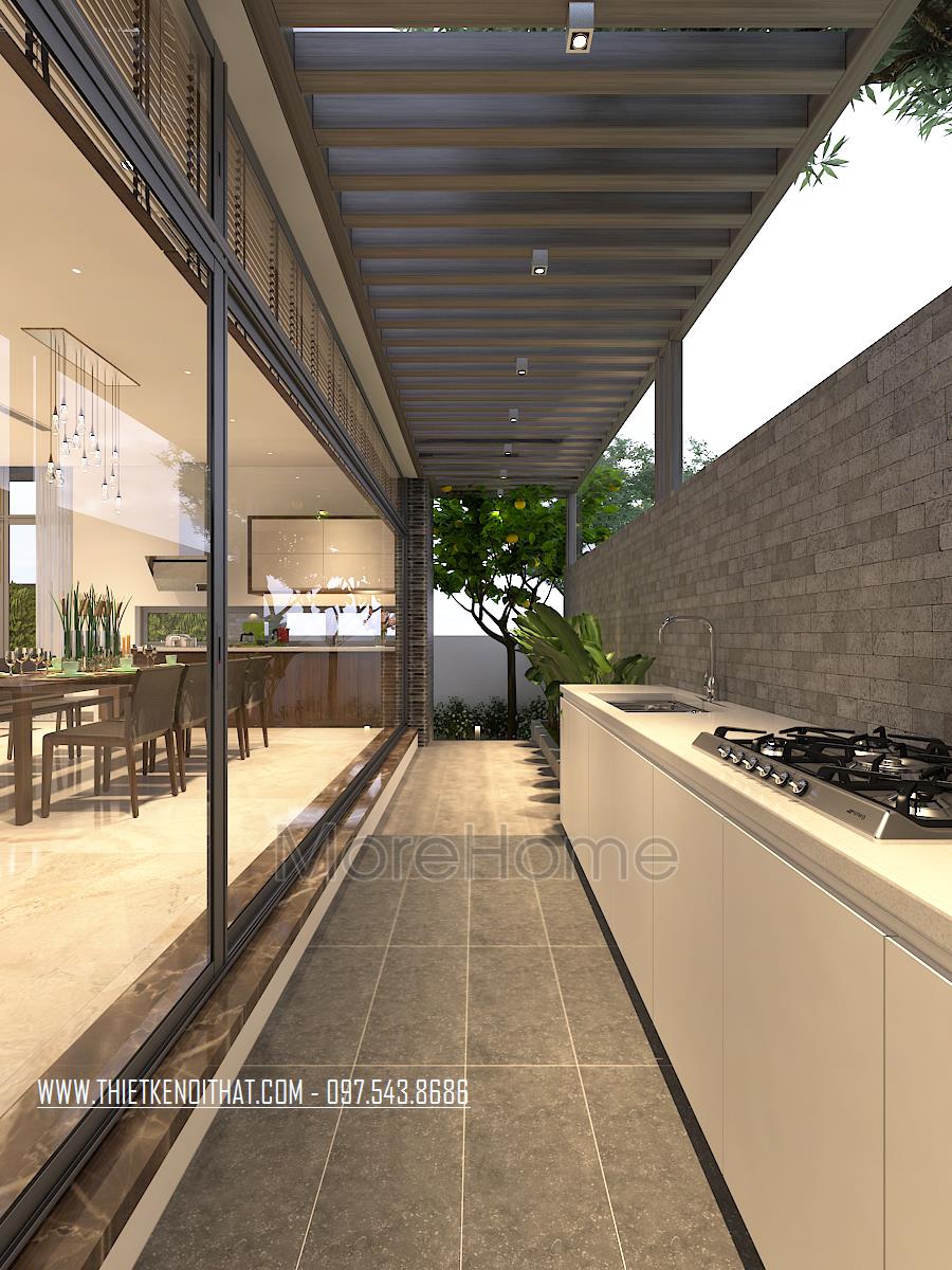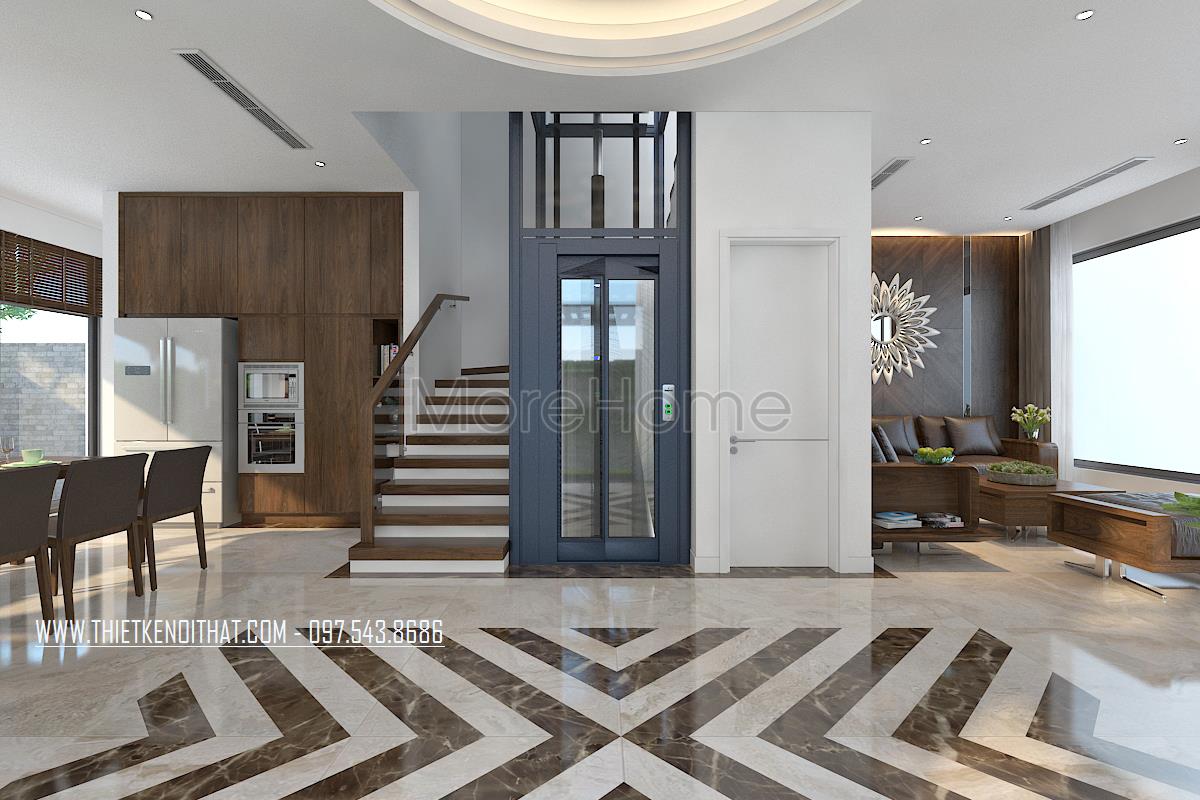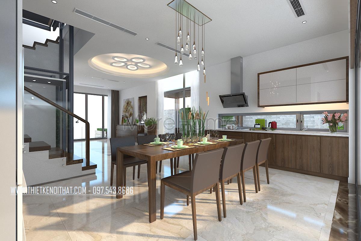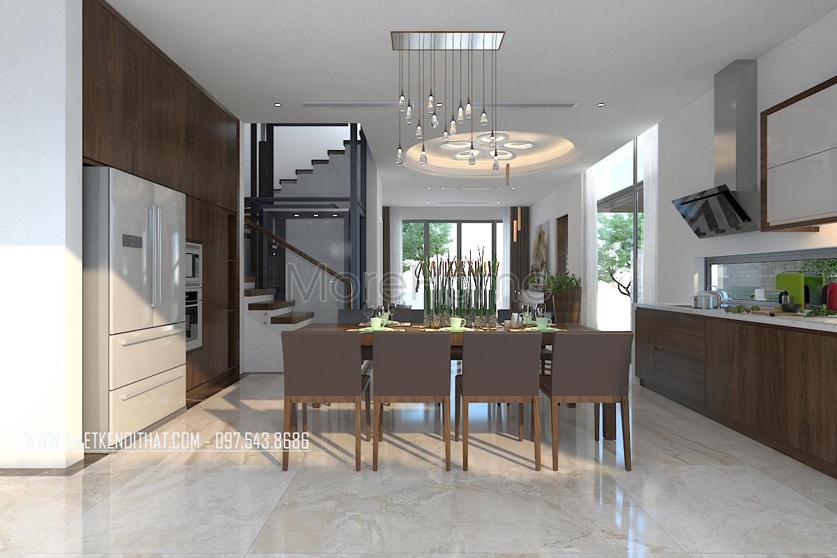 Phòng ăn và phòng bếp của biệt thự được tách biệt với phòng khách nhờ vào mảng tường của cầu thang máy và cầu thang bộ. Bên tay trái của cầu thang là hệ thống phòng ăn và phòng bếp. Bộ bàn ăn 8 ghế thiết kế hiện đại được đặt giữa không gian bếp. Bộ bàn ghế ăn gỗ óc chó được thiết kế hiện đại vuông thành góc cạnh kết hợp với hệ đèn thả hiện đại tạo không gian bếp sang chảnh.