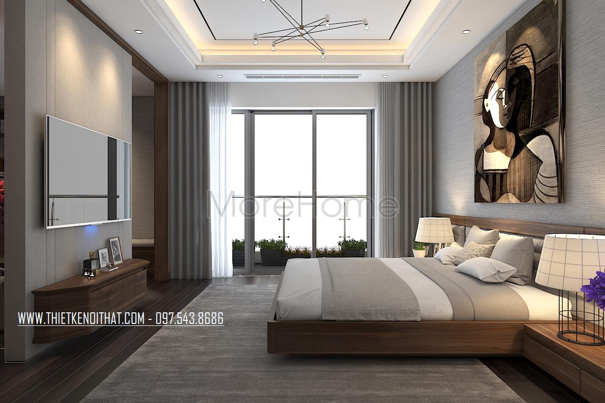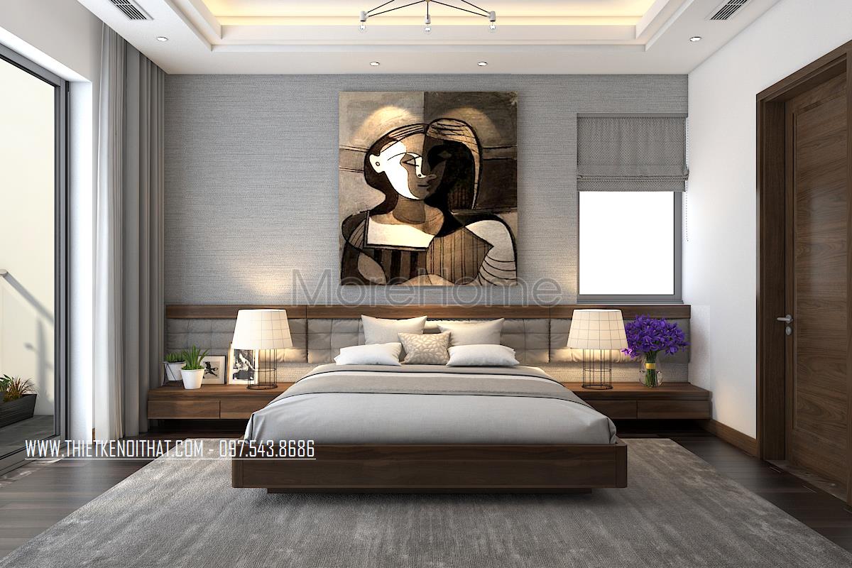 Theo đúng như trao đổi ban đầu thì không gian phòng ngủ của gia đình sẽ được thiết kế theo yêu cầu của từng thành viên để phù hợp với thói quen sinh hoạt của mỗi người. Mẫu giường ngủ gỗ óc chó được thiết kế cao cấp hiện đại và sáng tạo, chất liệu làm bằng gỗ đã mang lại vẻ đẹp tự nhiên rồi nhưng ở đây KTS Morehome lại thiết kế đa năng với hệ tab đầu giường xuyên suốt với giường từ bên trái sang bên phải và được ốp nỉ tạo sự sang trọng cho chiếc giường.