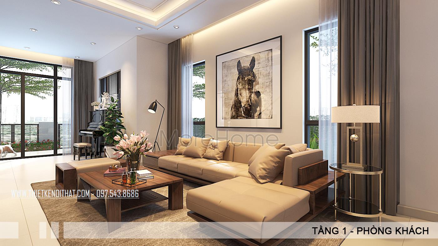Nhìn vào không gian phòng khách này bạn có thể thấy được sự tối giản trong thiết kế của KTS Morehome. Phòng khách ngôi biệt thự có diện tích rộng, có độ thông thoáng cao nên các KTS đã lựa chọn một bộ sofa gỗ óc chso có kích thước lớn, được thiết kế tối giản các chi tiết rườm rà tạo nên vẻ đẹp hiện đại và vô cùng sang trọng.