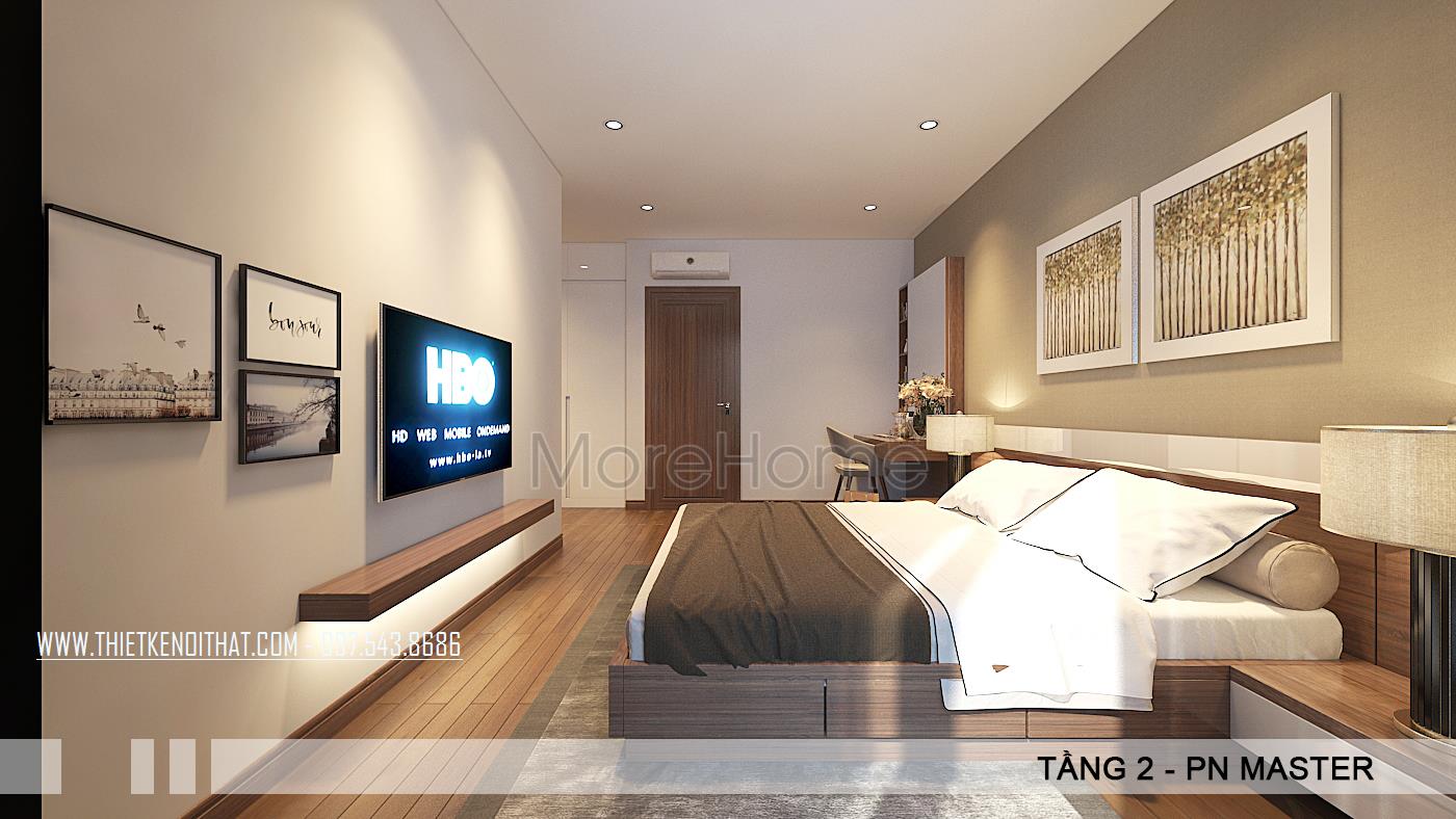 Phòng ngủ được thiết kế với mẫu giường gỗ óc chó cao cấp, thông minh giúp cho gia chủ có được giấc ngủ ngon. Nó còn mang lại vẻ đẹp tinh tế cho không gian phòng ngủ. Hệ tủ và kệ trang trí cũng được sử dụng chất liệu gỗ óc chó để tạo nên sự đồng nhất về màu sắc cho căn phòng.