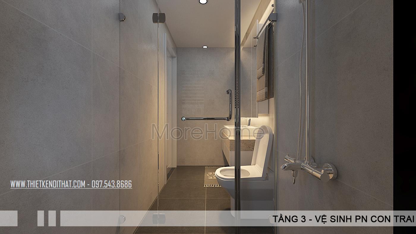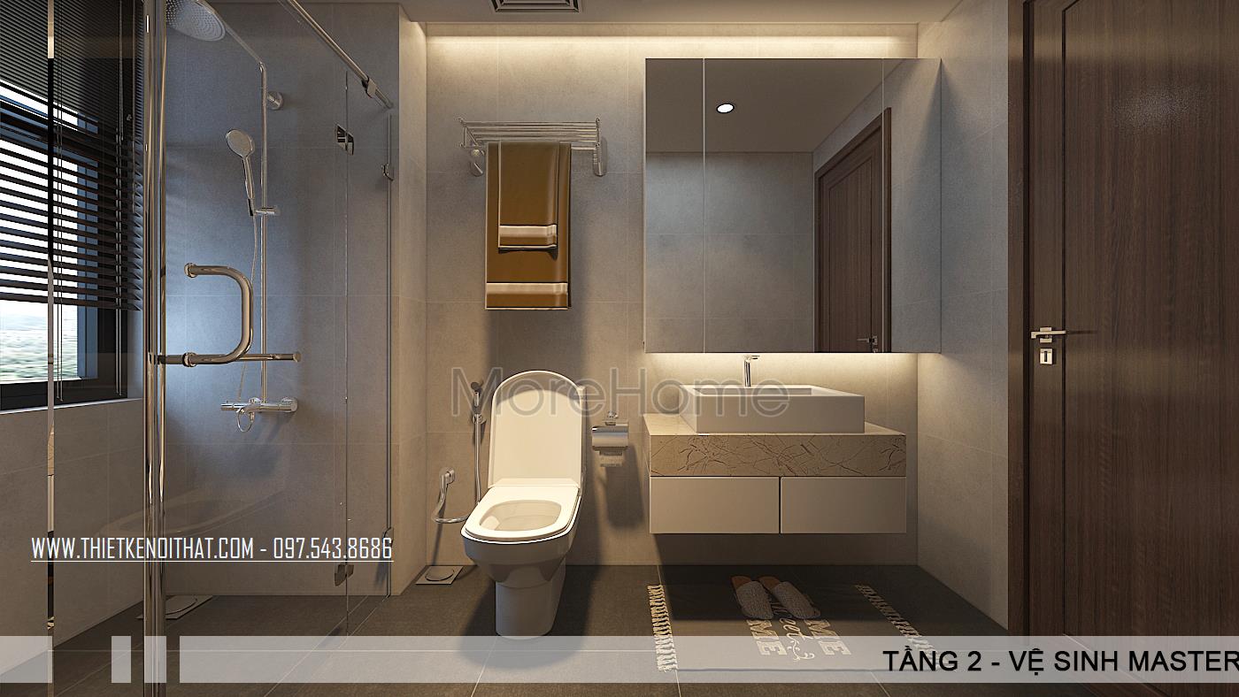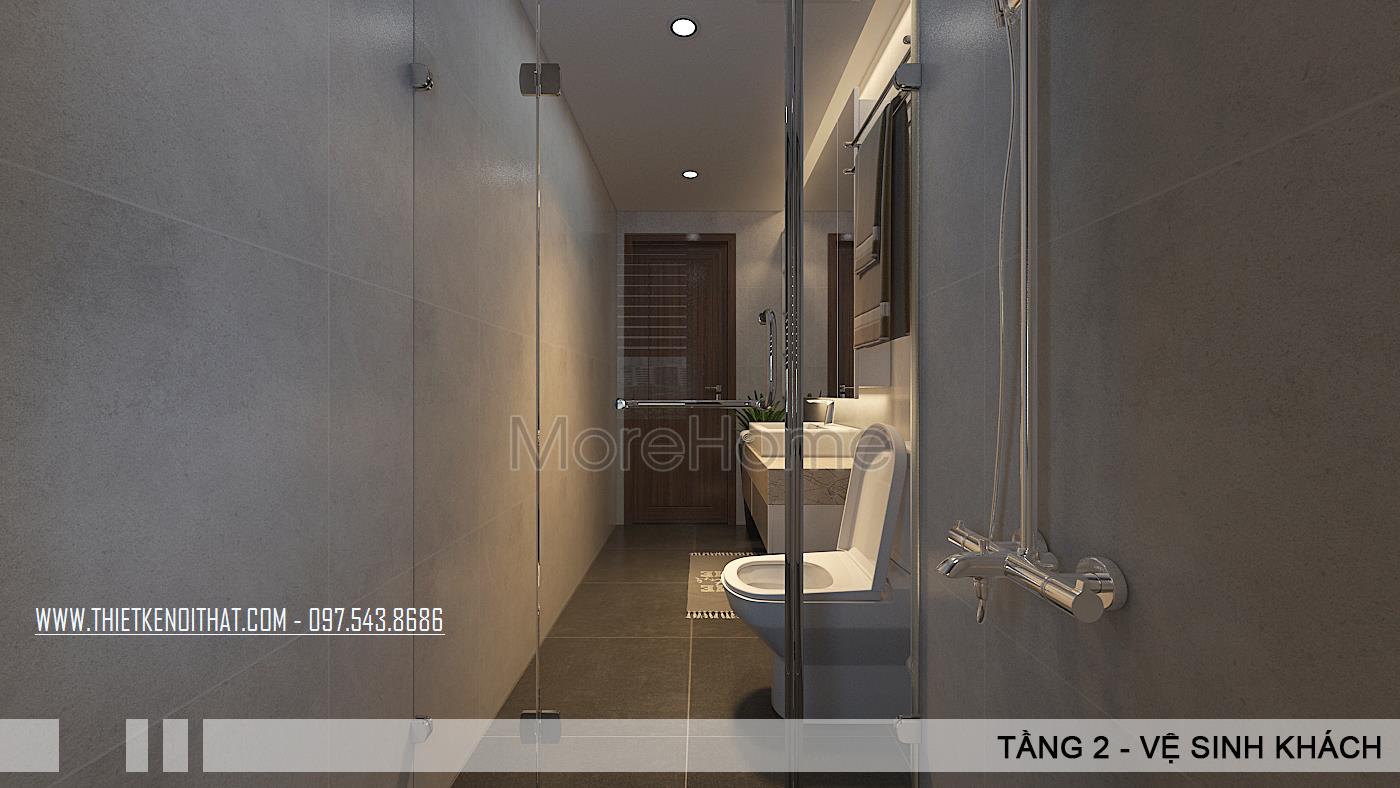 Thiết kế phòng tắm đơn giản, tinh tế và tiện nghi với vách kính phòng tắm và thiết bị vệ sinh hiện đại. Mang đến người dùng cảm giác thư thái nhất.