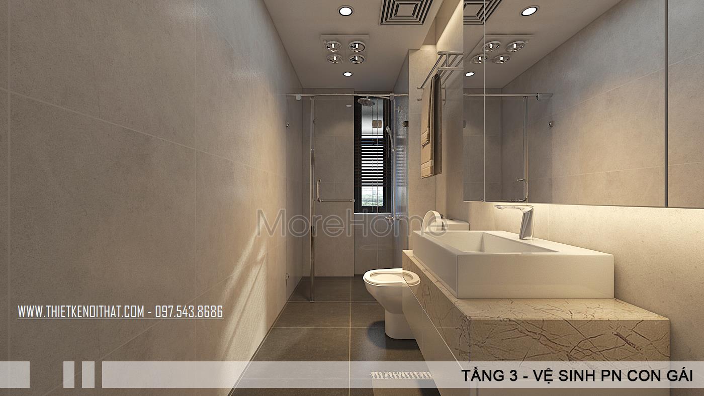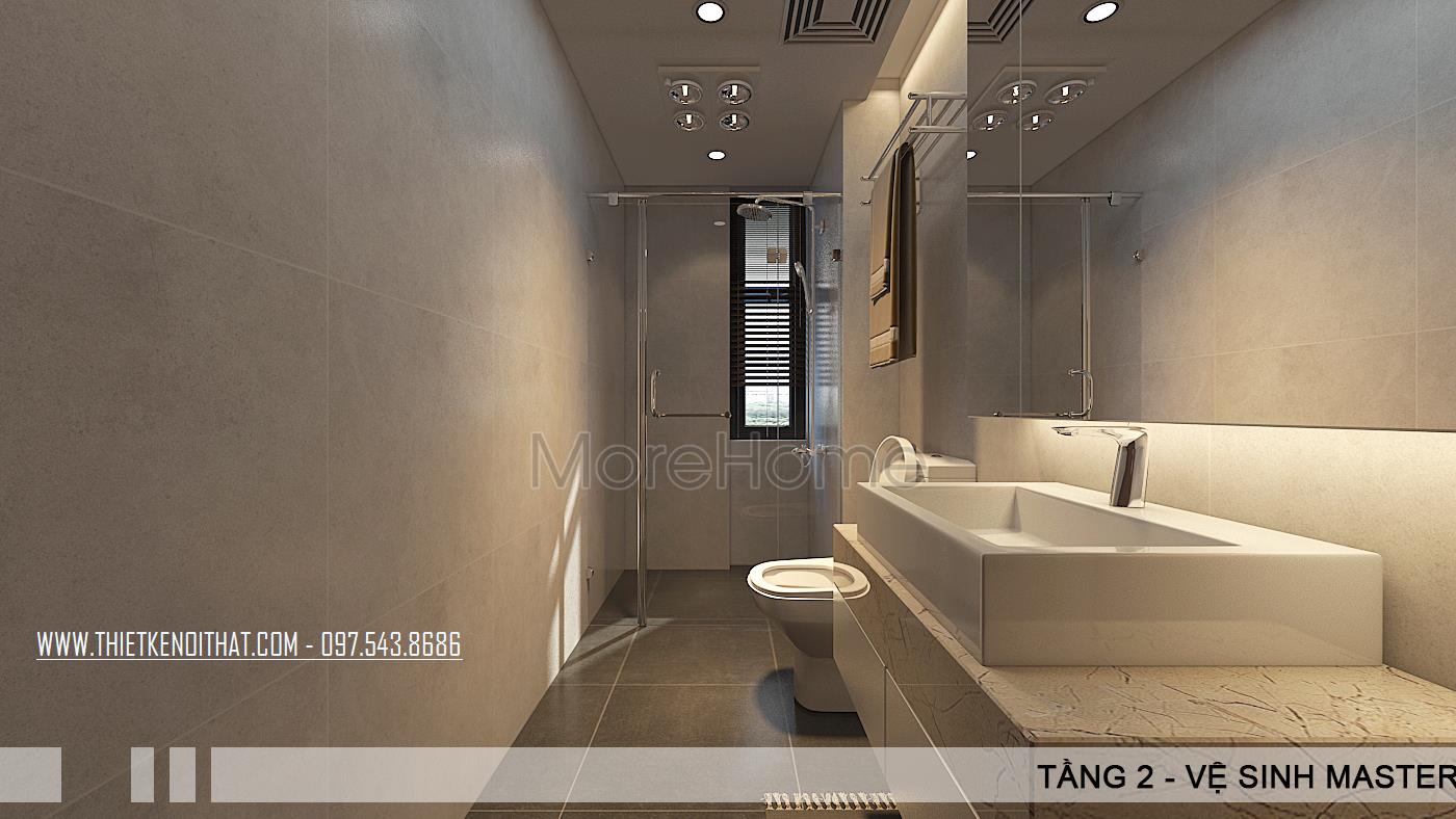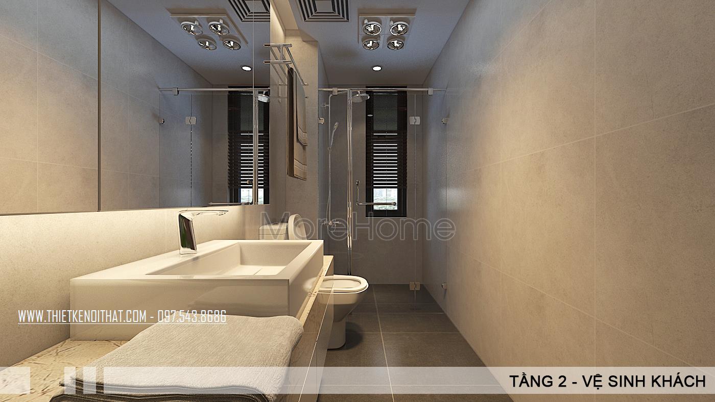 Thiết kế phòng tắm đơn giản, tinh tế và tiện nghi với vách kính phòng tắm và thiết bị vệ sinh hiện đại. Mang đến người dùng cảm giác thư thái nhất.