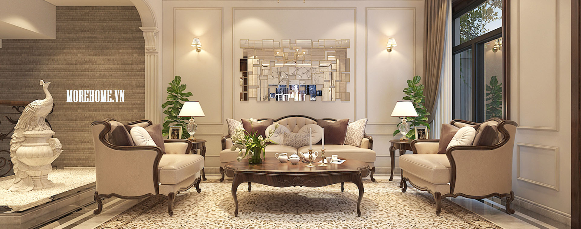 Bước đến phòng khách tân cổ điển, vẫn mẫu sofa gỗ cao cấp ấy nhưng chất liệu nệm là da cao cấp tạo không gian phòng khách đẳng cấp hơn bao giờ hết. Mảng tường phía sau chiếc sofa được trang trí với mẫu gương ghép ốp tường hiện đại, mới lạ tạo cho căn phòng thêm sang trọng và tinh tế. Đối điện với bộ sofa là mảng tường được đặt chiếc tivi màn hình phẳng cùng với chiếc kệ tivi bằng gỗ tự nhiên màu trầm tạo nên sự tiện nghi cho gia chủ.