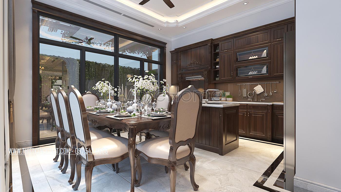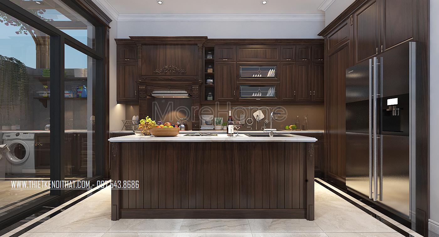 Thiết kế phòng bếp kết hợp phòng ăn cao cấp với chất liệu gỗ tự nhiên. Không gian bếp đa năng với tủ bếp gỗ tự nhiên chắc chắn, an toàn cùng với chiếc đảo bếp ngăn cách giữa không gian bếp và bàn ăn.