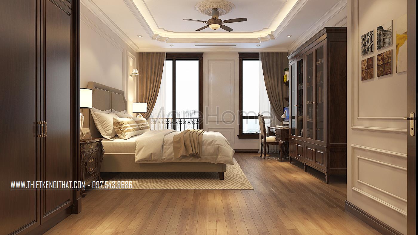 Tầng 2 căn biệt thự là không gian nghỉ ngơi của gia chủ. Phòng ngủ được thiết kế khá hiện đại và tiện nghi với đồ nội thất bằng gỗ. chiếc giường gỗ đơn giản với gỗ tự nhiên tạo sự chắc chắn an toàn khi ngủ. Hệ tủ sách và bàn làm việc được thiết kế kéo dài tạo sự tiện nghi cho gia chủ. Tủ áo được thiết kế với hệ của mở thật chắc chắn và đa năng.