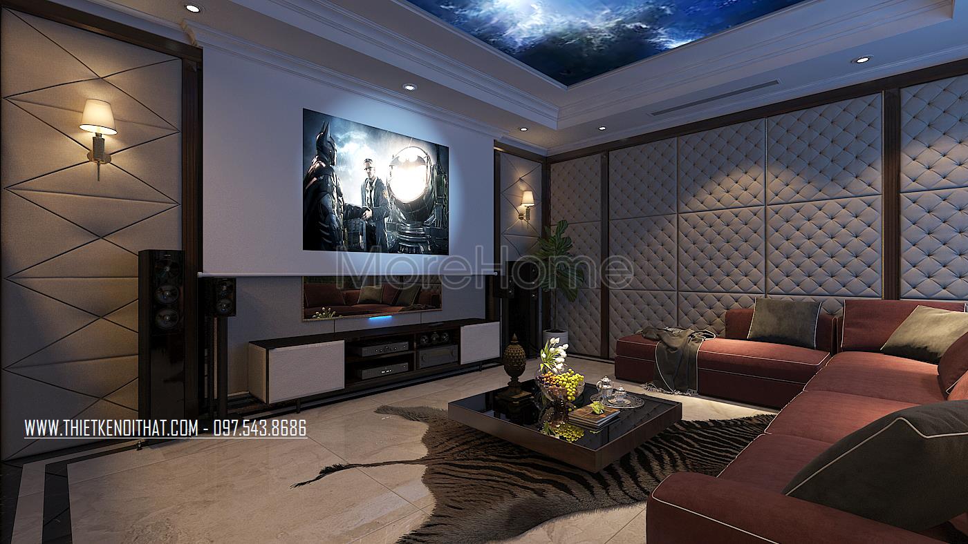 Tầng hầm của căn biệt thự được thiết kế với không gian phòng rượu kết hợp phòng karaoke cao cấp. Ở đây, KTS đã thiết kế với bộ sofa chữ L bằng nỉ màu đỏ mận cao cấp kết hợp với hệ tủ rượu đa năng giúp gia chủ trưng bày rượu một cách sang trọng và tinh tế nhất. Một chiếc tivi lớn cùng với hệ loa đài âm thanh tạo nên không gian giải trí thật tiện nghi. Mảng tường cao cấp được ốp bằng nệm sofa giúp cho việc cách âm tối đa nhất.