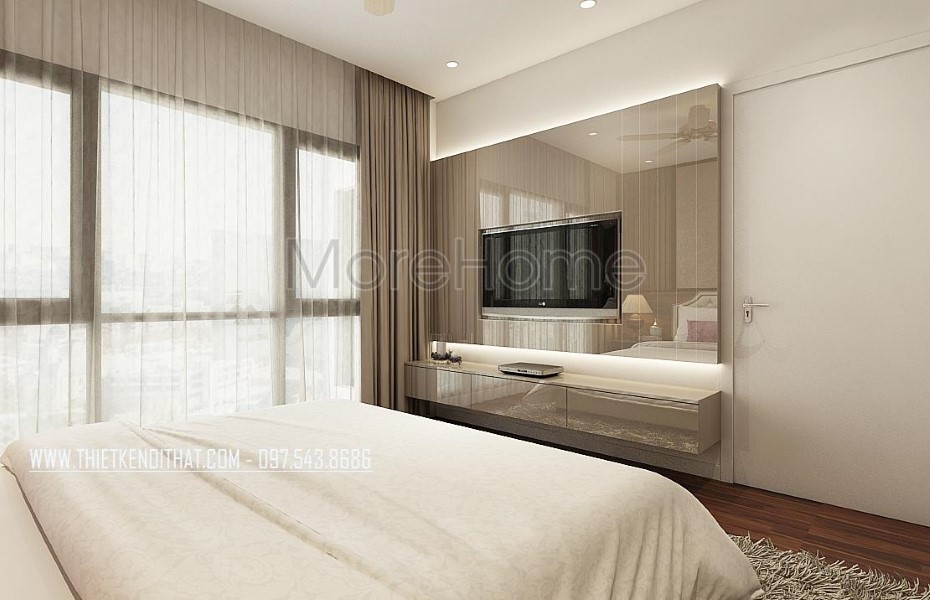 Tiếp theo là thiết kế nội thất không gian phòng ngủ. Nội thất phòng ngủ lấy điểm nhấn màu sắc là tone màu nâu ấm áp. Đây là một trong những tone màu mang lại hiệu ứng cảm xúc tích cực cho gia chủ, gợi mở một không gian vô cùng gần gũi và yên bình. Thiết kế tủ gỗ gần như âm tường là một trong những điểm đặc biệt giúp không gian trở nên mở và thoáng hơn rất nhiều. Bên cạnh đó, thiết kế kết hợp kệ và ngăn chứa đồ là một ý tưởng không tồi mang đến sự tiện nghi cho gia chủ.