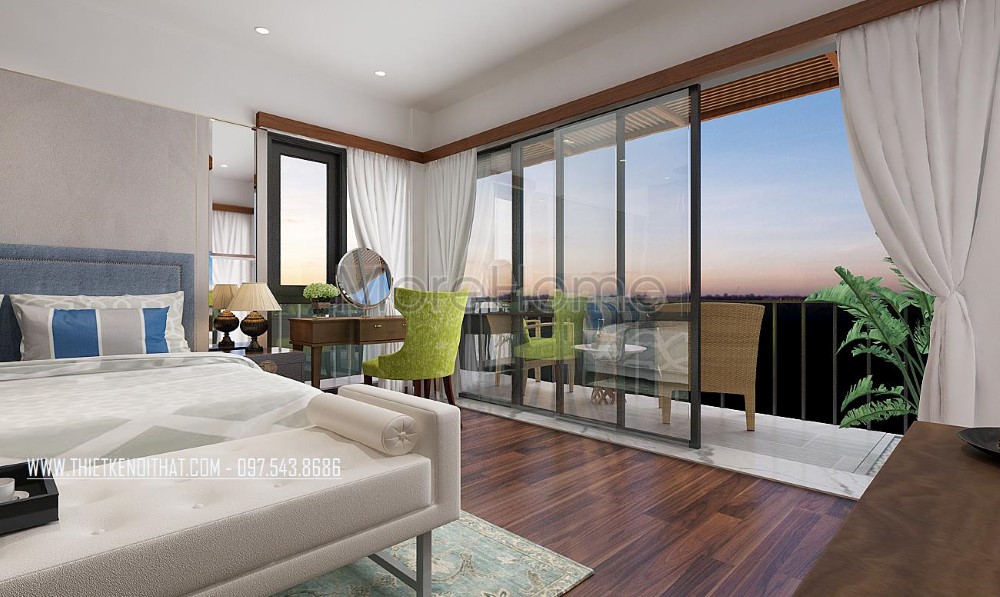 Thiết kế không gian ban công mở là nơi thu hút nhất đối với gia chủ. Với đặc điểm view rộng với không gian vô cùng dễ chịu giúp gia chủ thư giãn sau một ngày dài làm việc. Thiết kế ghế tựa sử dụng vật liệu tre đan khá đơn giản và tiện dụng, dễ dàng thay thế, di chuyển khi cần thiết. Phía trên mái che là thiết kế thanh ngang gỗ xếp ấn tượng vừa đảm bảo tính công năng lại tạo điểm nhấn cho thiết kế.