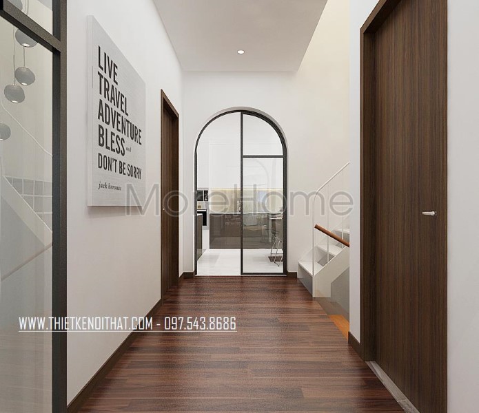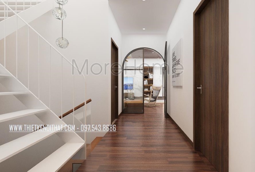 Thiết kế nội thất biệt thự Xuân Phương là sự kết hợp hài hòa của các thiết kế mang vẻ đẹp phá cách và hiện đại. Điển hình là cầu thang được sử dụng vật liệu mới lạ. Thay vì việc ứng dụng cấu trúc build-in cứng nhắc thì kiến trúc sư lại khéo léo sử dụng vật liệu nhẹ, tạo không gian mở và khoảng trống giữa các bậc thang góp phần lớn tăng độ thoáng và mở cho thiết kế.