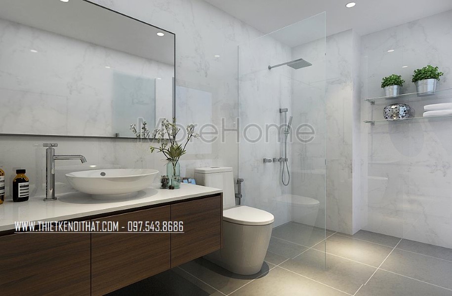 Căn phòng tắm kết hợp nhà vệ sinh là một trong những không gian thiết kế ấn tượng của căn biệt thự. Đối với nhiều người phòng tắm không hề là một không gian phụ, thiết kế nội thất phòng tắm luôn đòi hỏi một sự hài hòa và cân bằng tuyệt đối, từ đó mang đến gia chủ cảm giác an toàn, dễ chịu, và an nhiên. Thiết kế nội thất sử dụng các vật liệu nhẹ là chủ yếu như kính cường lực trong suốt, đá tự nhiên, gạch ốp, hay gương phản chiếu,… tất cả đều có độ phản chiếu ánh sáng nhẹ giúp tạo cảm giác cơi nới cho không gian hẹp, và tăng độ mở cho căn phòng.