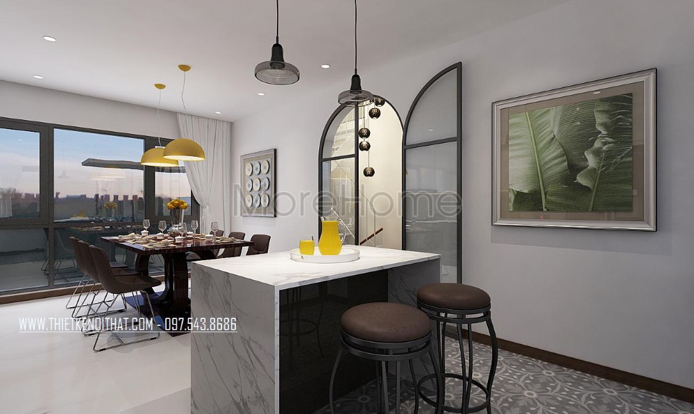 Cuối cùng là thiết kế nội thất bếp và bàn ăn hiện đại. Hai thiết kế này được sắp xếp liền kề mang lại cảm giác tiện nghi và mở rộng tầm quan sát, bao quát cho gia chủ. Thiết kế kệ và tủ bếp đơn giản, gần như tạo mặt phẳng ngang liền giúp tiết kiệm không gian. Thiết kế không hề nhấn mạnh đến các chi tiết trang trí cầu kỳ và tập trung hơn vào tính công năng và sự thuận tiện. Bàn ăn được thiết kế đơn giản, không gian đủ rộng cho các bữa cơm hay sinh hoạt ấm cũng của gia đình. Ngoài ra, các điểm nhấn màu sắc từ đèn trang trí hay các vân gỗ trên bàn ăn cũng góp phần tăng thêm sức cuốn hút cho không gian.