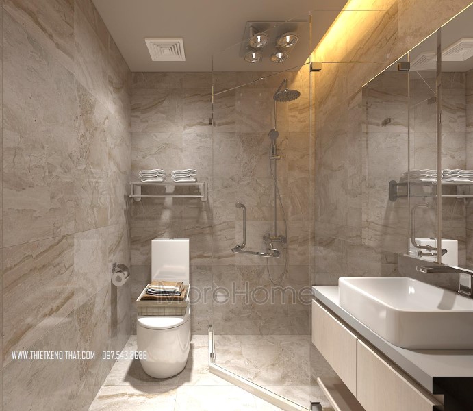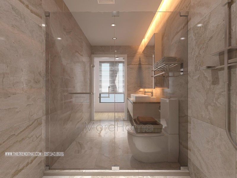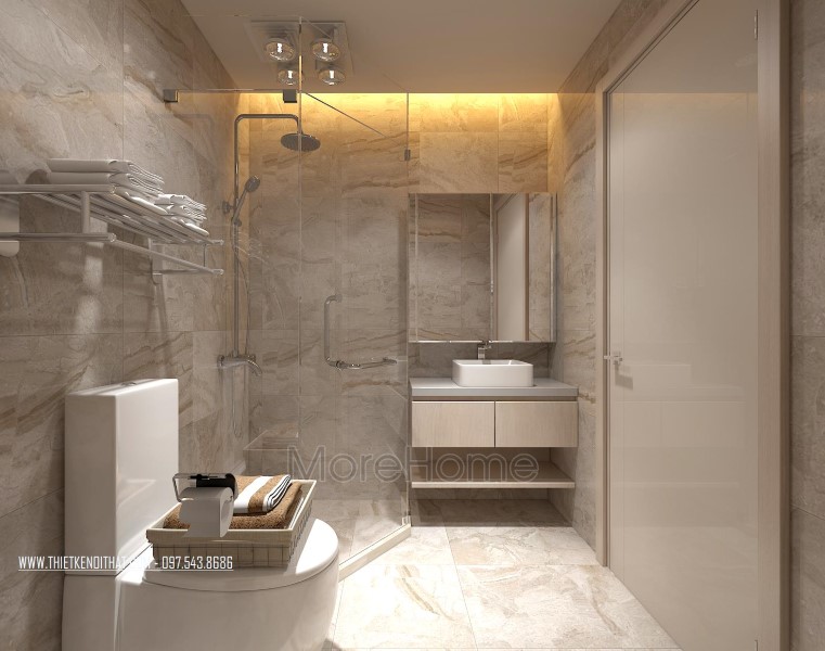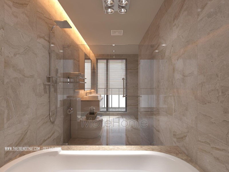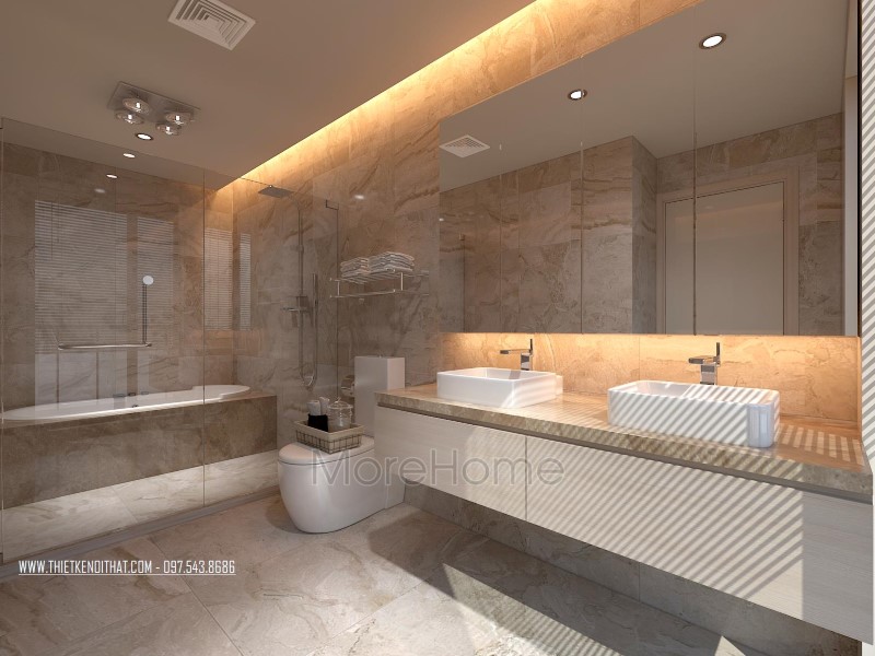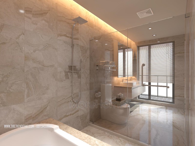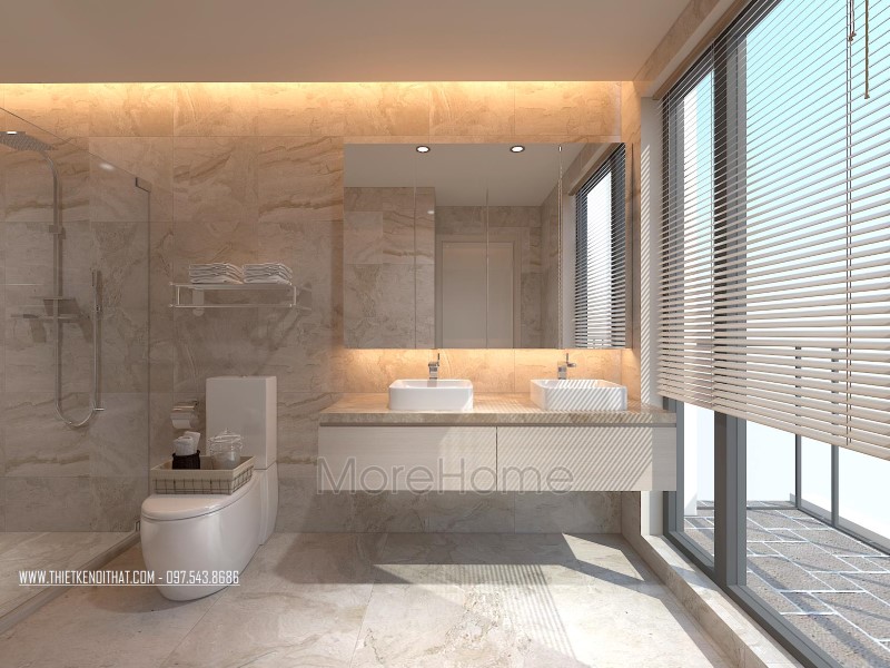 Cuối cùng là thiết kế không gian phòng tắm hiện đại. Phòng tắm nổi bật với các thiết kế hiện đại và sang trọng. Các vật liệu xây dựng nhẹ lựa chọn khá kỹ lưỡng như kính cường lực, gương phản chiếu, đá tự nhiên,… giúp tạo độ tương phản nhẹ cho không gian, góp phần tăng độ mở cho phòng vệ sinh.