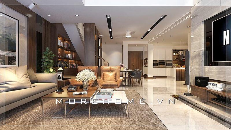 Phong cách hiện đại ấn tượng với chất liệu gỗ chủ đạo trong thiết kế nội thất phòng khách căn hộ thông tầng.
