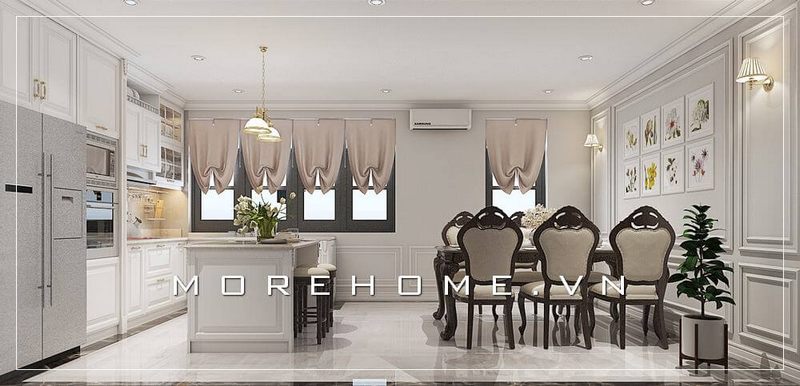 Thiết kế nội thất phòng bếp tân cổ điển sang trọng, lựa chọn tone màu trắng chủ đạo tạo nên không gian tinh tế và ấn tượng tôn lên đẳng cấp cho gia chủ