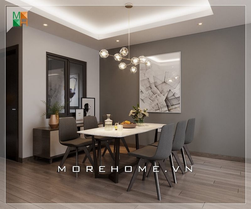 Trang trí khu vực phòng ăn theo phong cách hiện đại, ấn tượng với cách bày trí như: đèn thả, tranh treo tường tạo điểm nhấn cho căn hộ chung cư
