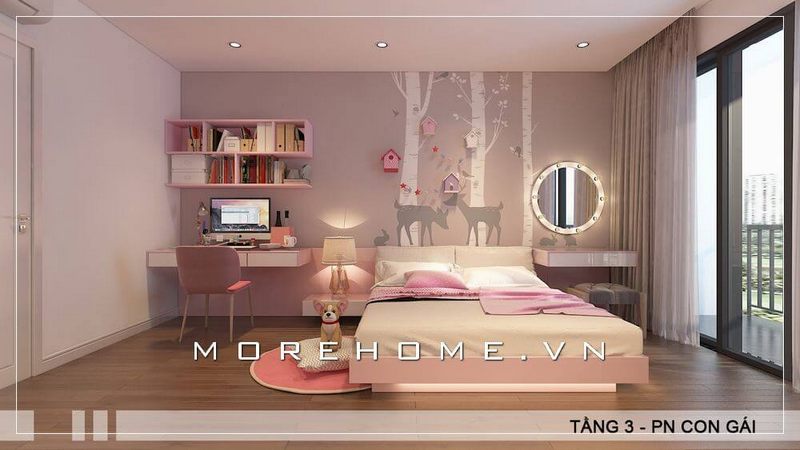 Trang trí nội thất phòng ngủ cho bé gái phong cách hiện đại sử dụng tone màu hồng tạo cảm giác dễ thương và nhẹ nhàng