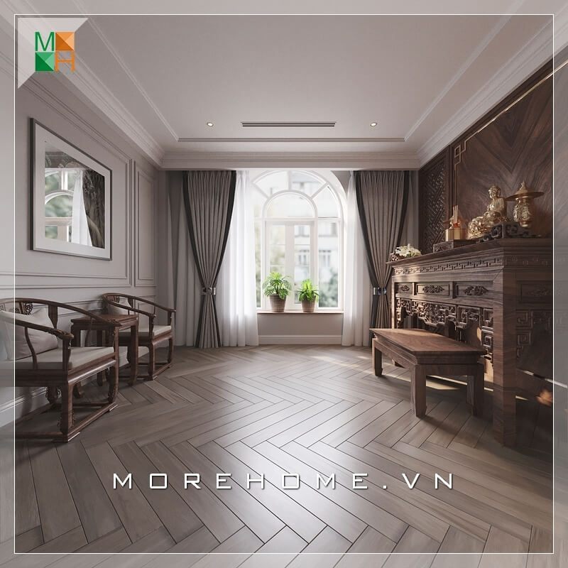 Chất liệu chính căn phòng thờ là gỗ óc chó tự nhiên cao cấp, sàn lát gỗ làm tăng sự sang trọng và sự đầu tư của gia chủ vào không gian nơi đây.
