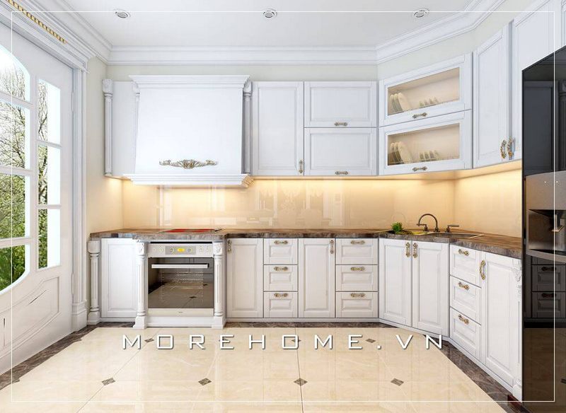 Tạo ra một không gian nấu nướng rộng và thoáng mát bằng cách kết hợp thiết kế phòng bếp biệt thự tân cổ điển sang trọng với nội thất bếp hiện đại.